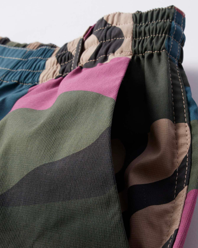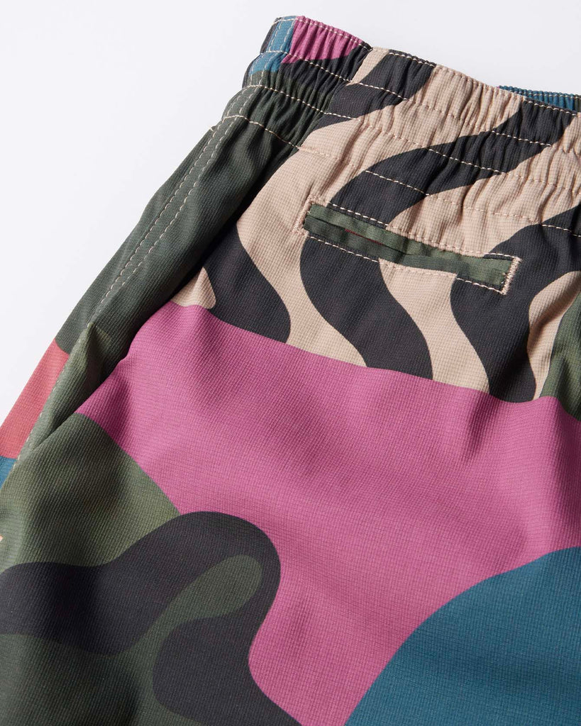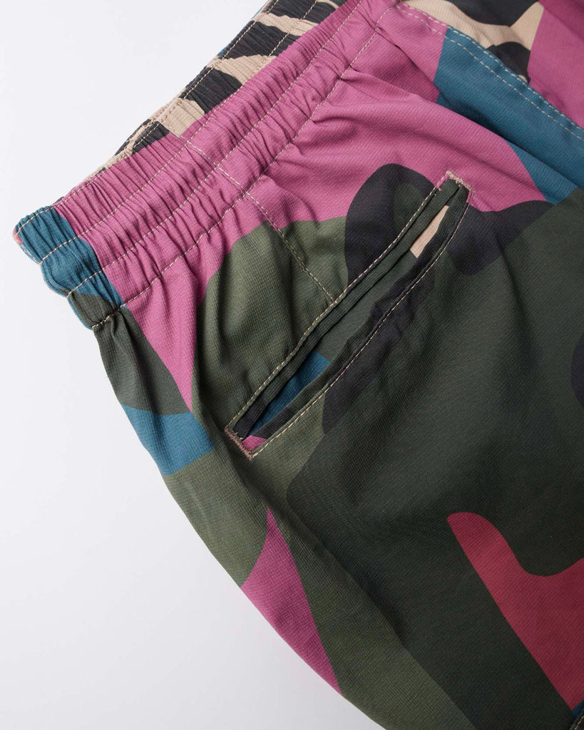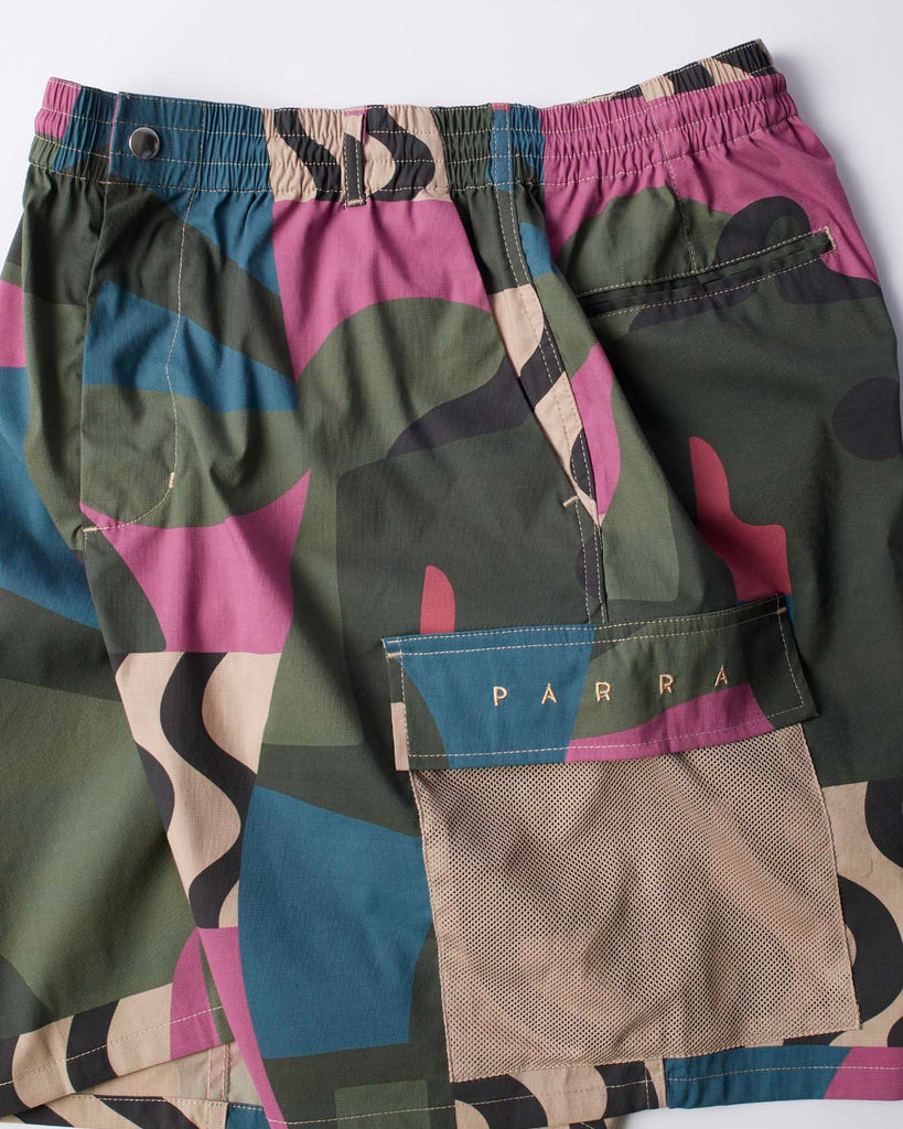 Shorts made from ripstop fabric that is printed all over with the Distorded camo artwork. Has a mesh pocket on the side with Parra embroidery on it. Slightly stretch.