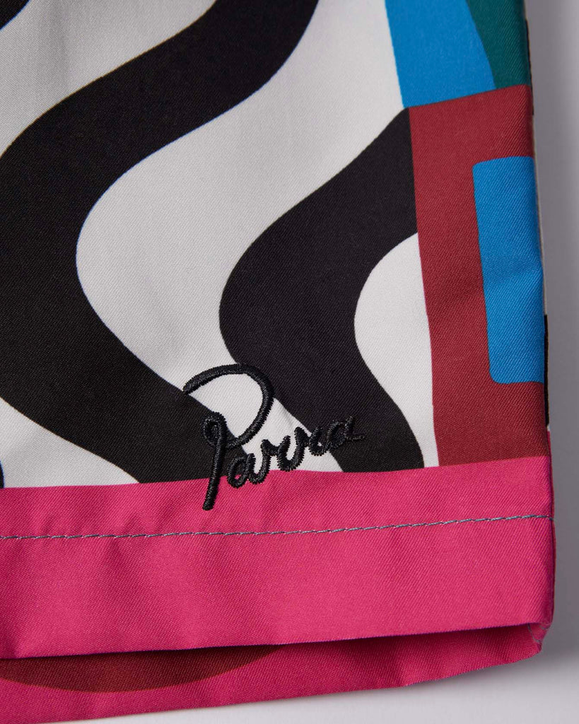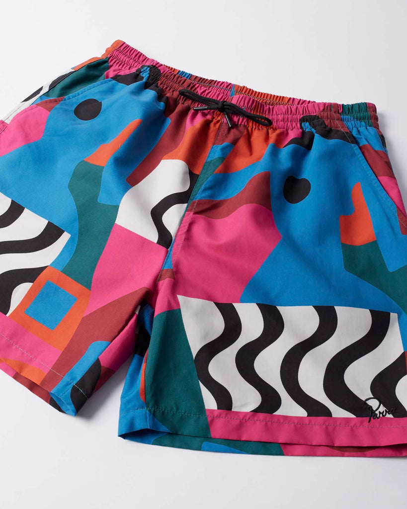 Swim shorts made of fast drying nylon. Printed all over with the Distorted water artwork. Signature logo embroidery at front.